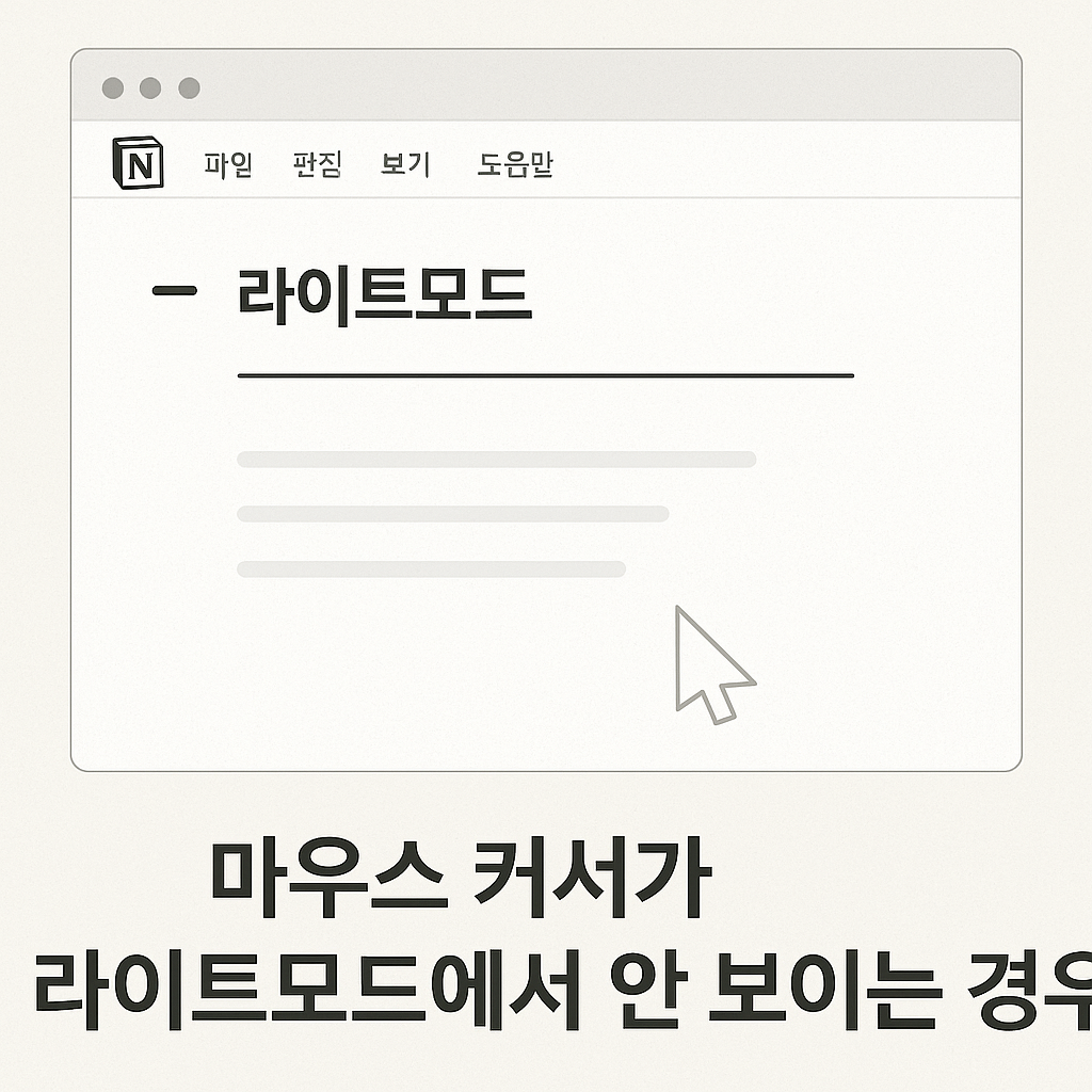 새로운 노트북에 노션(Notion)을 설치해서 사용하려는데,라이트모드에서는 마우스 커서가 없어지네...? 처음엔 그냥 버그인가 싶어서 한동안 다크모드로만 쓰다가,“이거 아무래도 해결해야겠다…” 싶어서 직접 찾아봤는데설정이 너무 단순해서 약간 허탈했다.✅ 노션에서 커서가 사라지는 이유답은 정말 간단하다.‘마우스 커서 색깔’ 문제였다.노션 라이트모드는 배경이 흰색이고,내 노트북 기본 커서 색도 흰색이었다.그러니까흰 배경 + 흰 커서 = 커서가 사라져 보이는 것처럼 느껴지는 현상이게 전부였다.그래서 해결 방법은👉 커서 색깔만 검정으로 바꿔주면 끝난다!아래에 단계별로 딱 보기 좋게 정리해 봤다.✔️ 해결 방법 1 : 윈도우 마우스 포인터 구성표 변경하기이 방법이 가장 기본적이고 빠르다.변경 방법윈도우 검색창에..