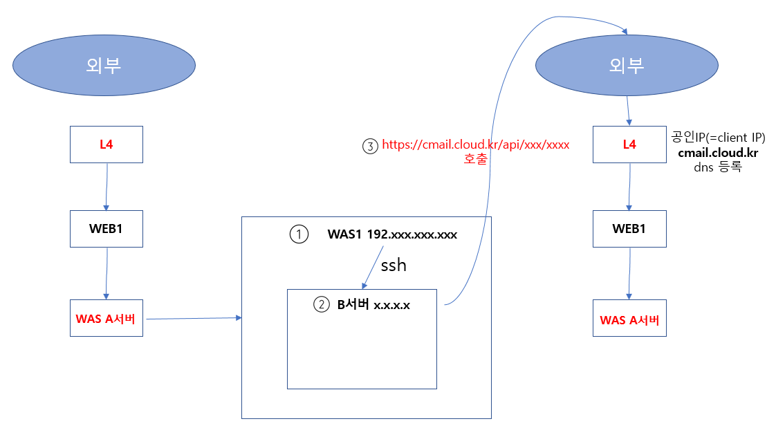 사설 대역에서 접속한 B서버는 https://cmail.cloud.kr/api/xxx/xxxx/xxxx 이라는 API URL 을 호출한다.