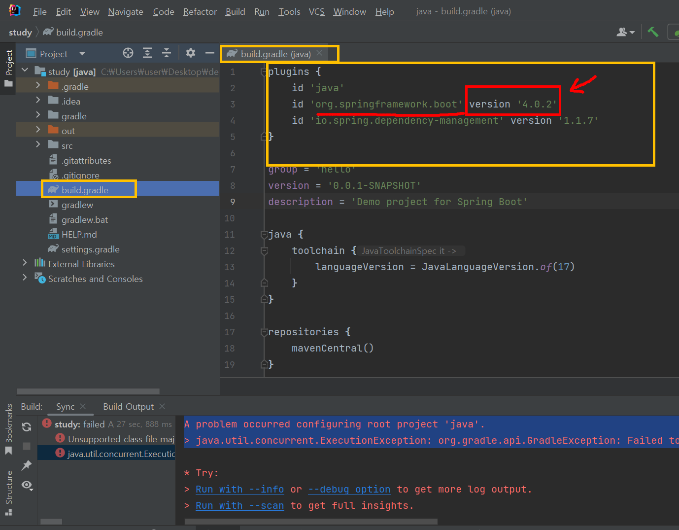 만약 Java 17을 꼭 써야 한다면, build.gradle 파일에 sourceCompatibility = '17' 설정이 들어있는지도 확인해봐야 한다.
