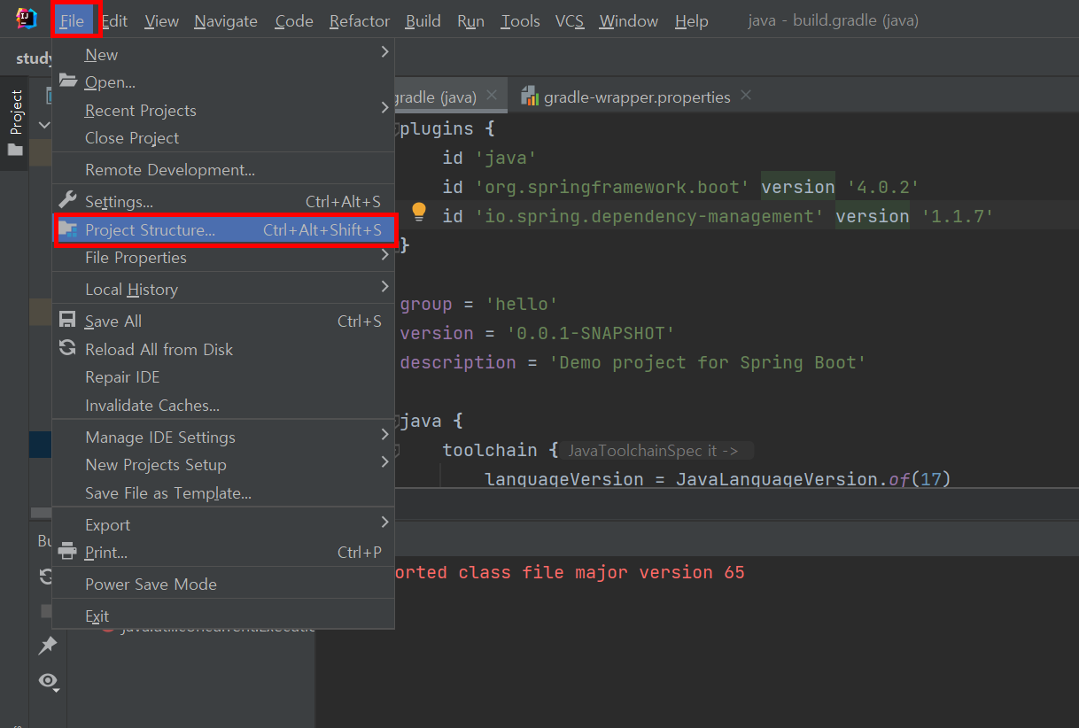 즉, 설정은 Java 17로 잘 했지만, 가져오려는 라이브러리가 "난 Java 21(major version 65) 없으면 일 안 해!"라고 거부하고 있는 상황인 것.