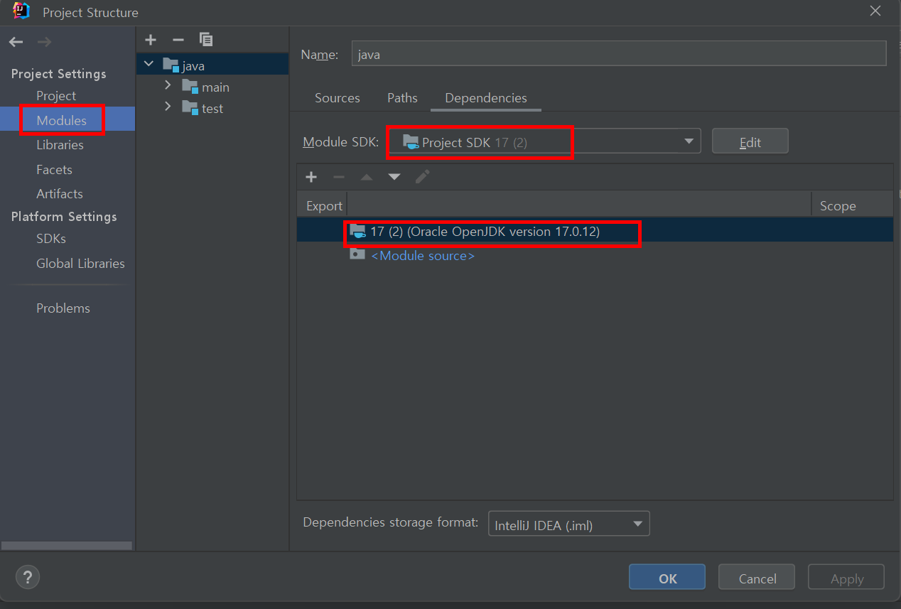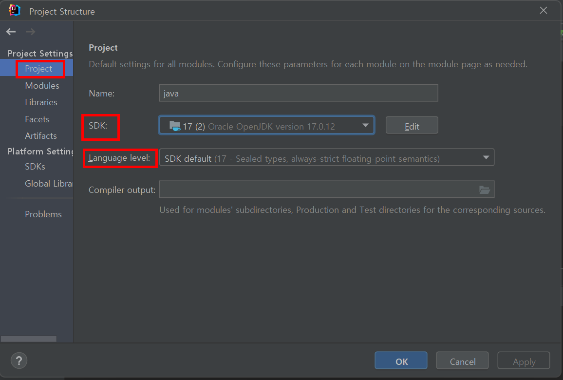 Project: SDK가 17로 설정되어 있는지 확인 ( 원하는 자바 버전으로 설정 되어 있는지 확인하는 것)