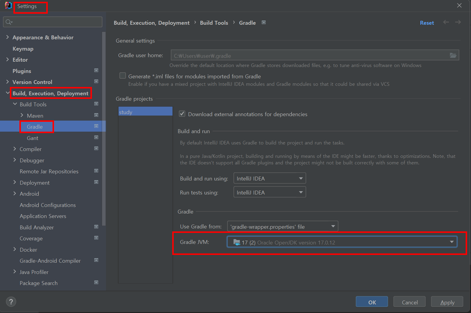 - 체크 포인트: Gradle JVM 항목이 Project SDK 또는 Java 17로 정확히 선택되어 있는지 확인